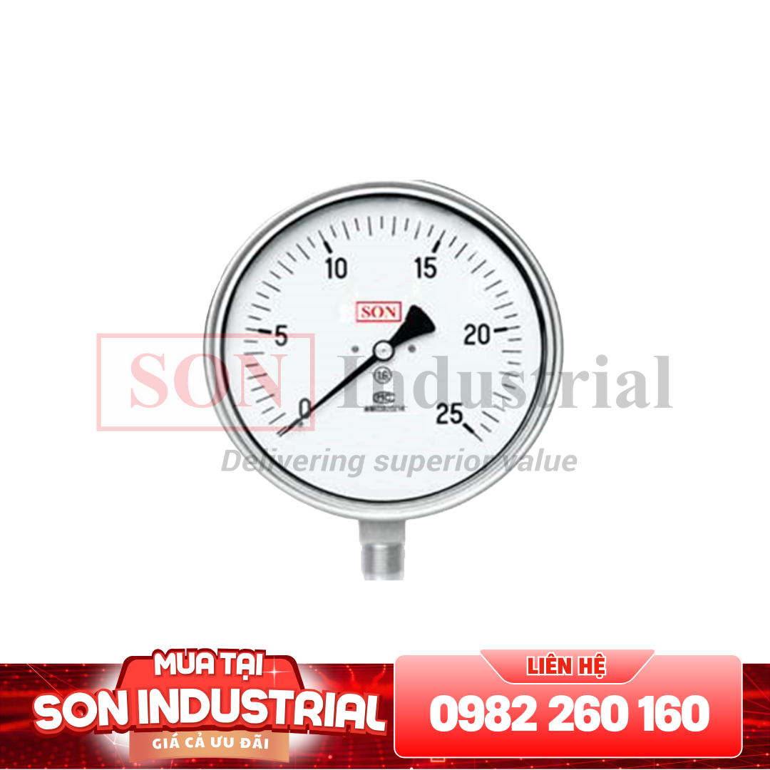 Model: SY60BF Kích thước: 2″ (50mm) Vật liệu vỏ: Inox Kết nối: BSP 1/4″ Độ chính xác: ± 1.6% Dãy đo: 0…10bar; 0…16bar Nhiệt độ max: 100°C Xuất xứ: SON INDUSTRIAL
