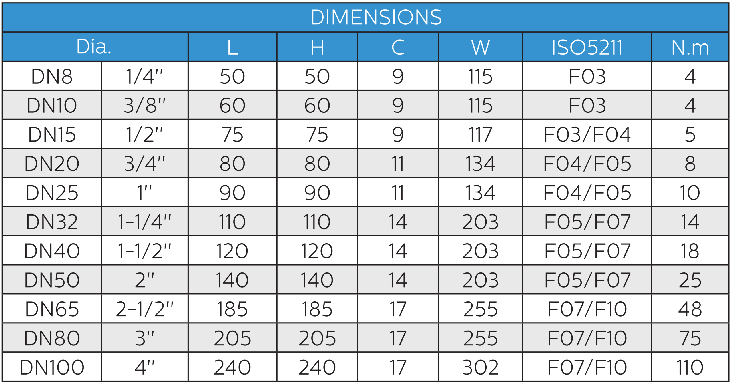- Kích cỡ danh định: DN15 (1/2”) – DN100 (4”)